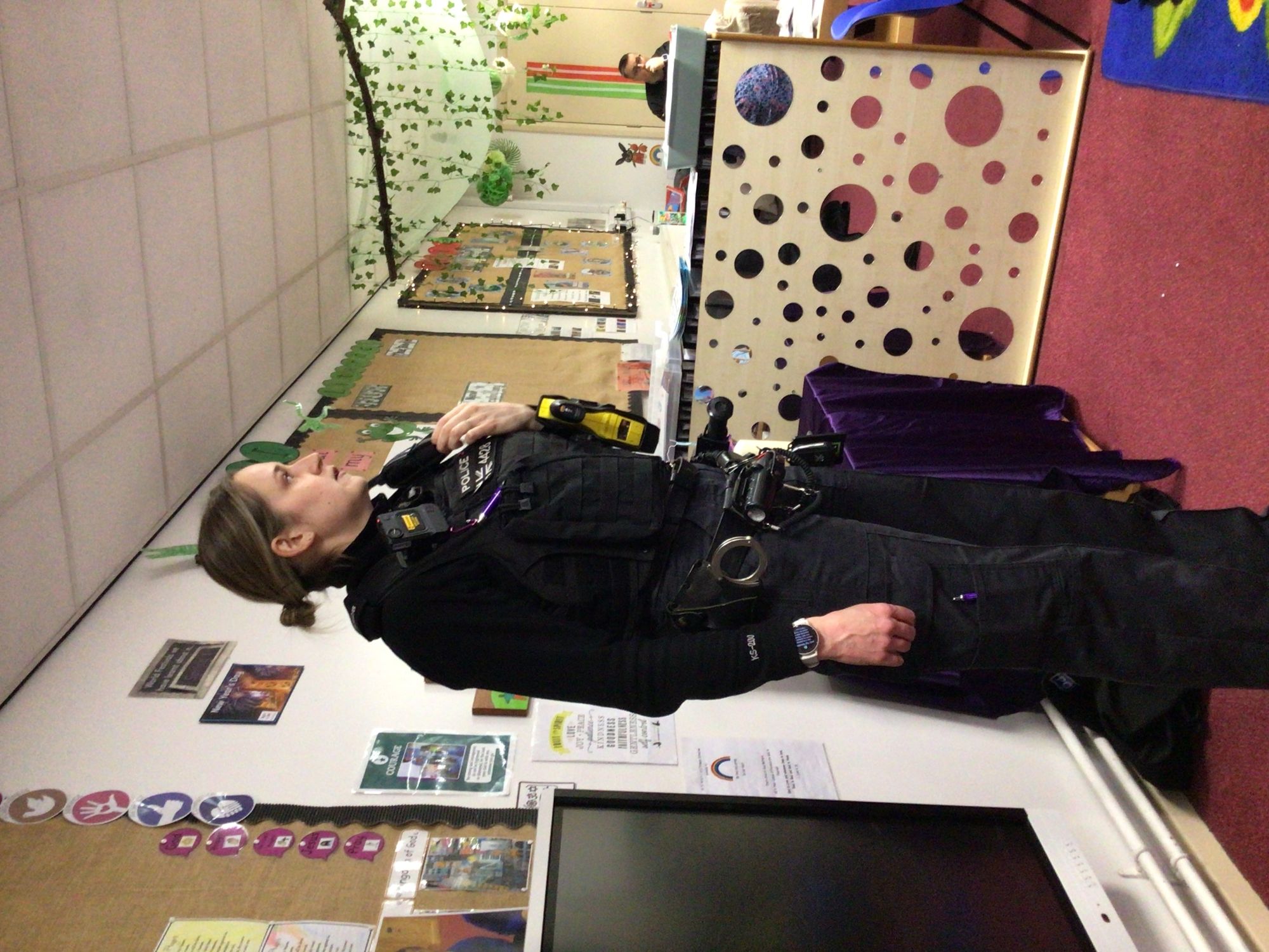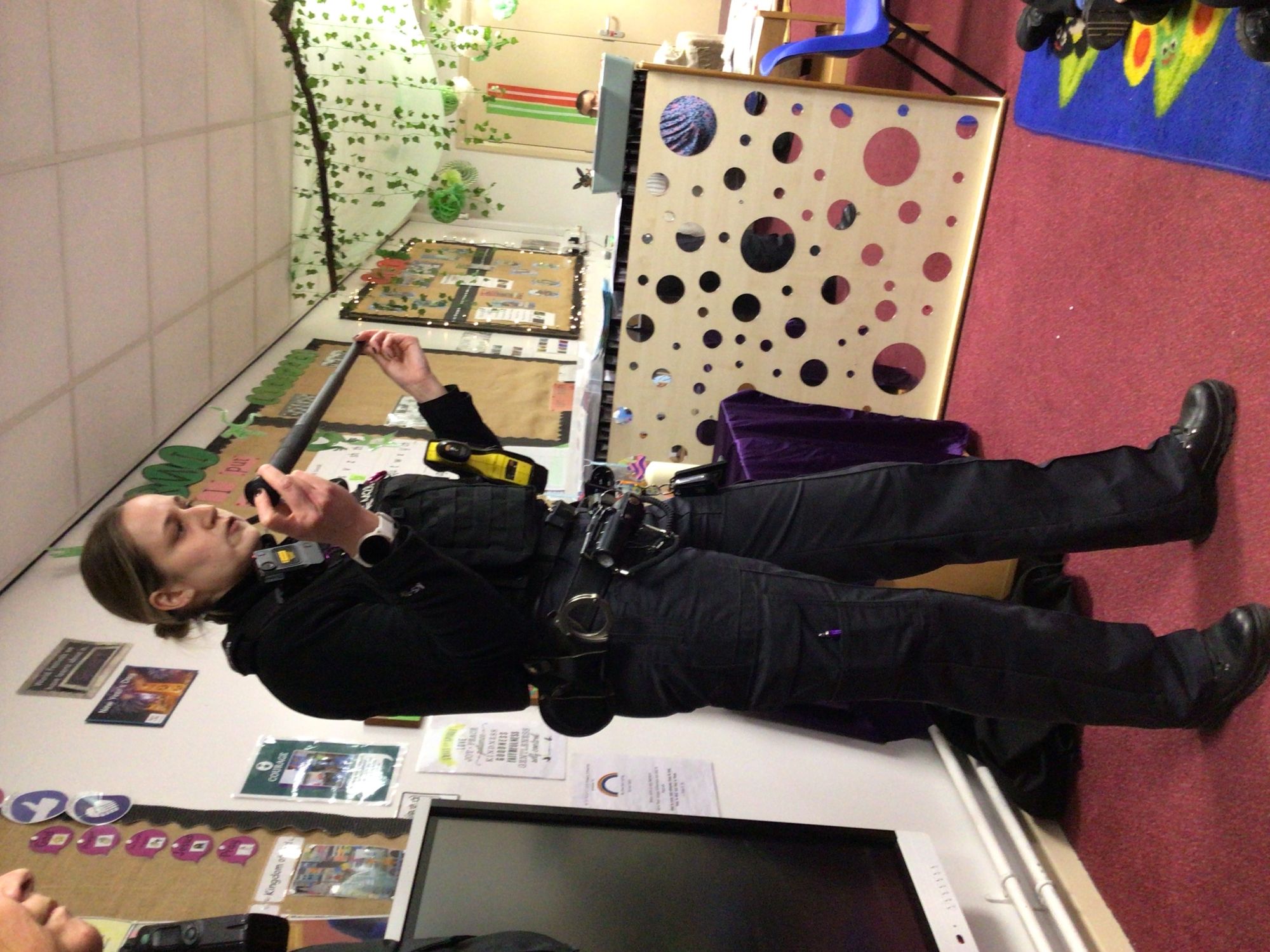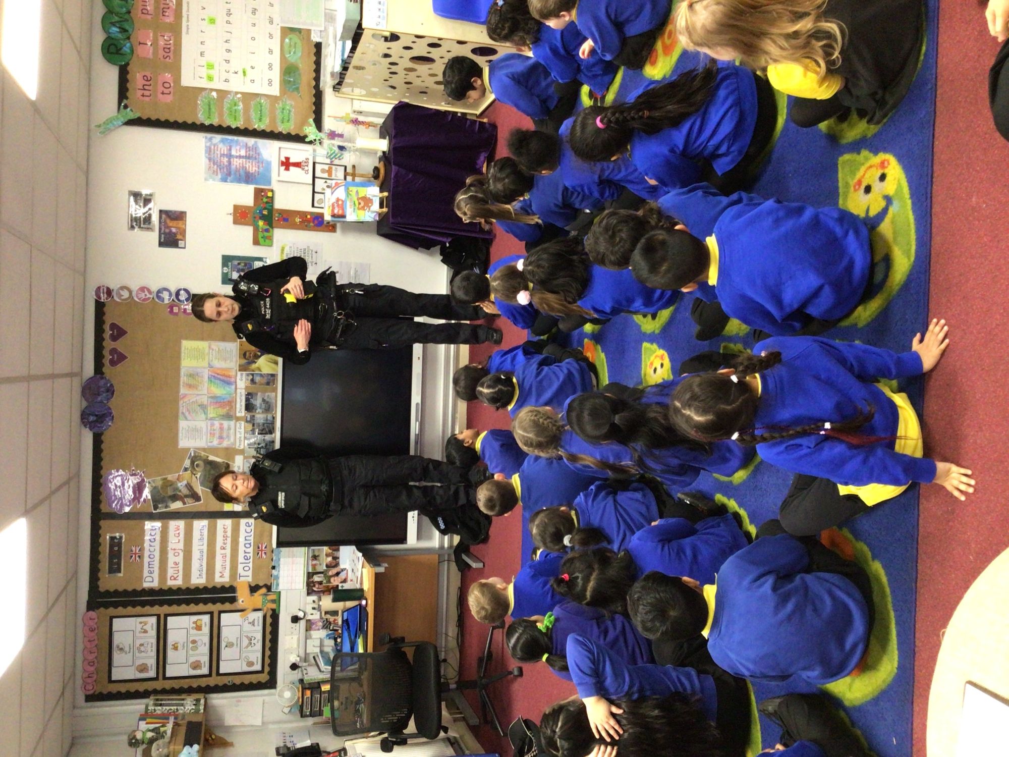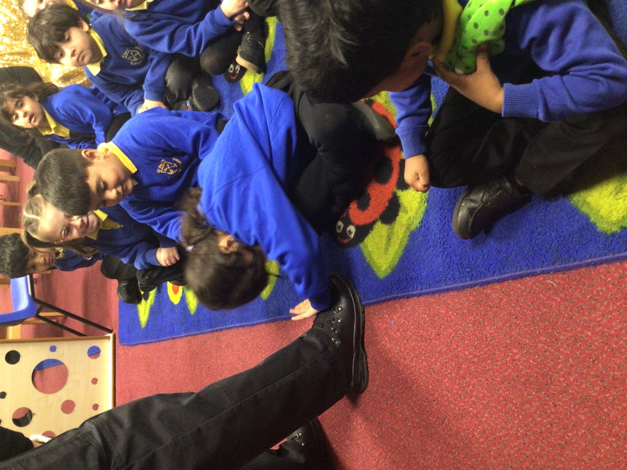 Today we were lucky enough to have a visit from PC Stacey and PCSO Sharon. They spoke to us all about their uniform, how they help in the community and then showed us the Police Van. We all got to have a turn inside the Police Van. They even put the lights on and set off the sirens for us.