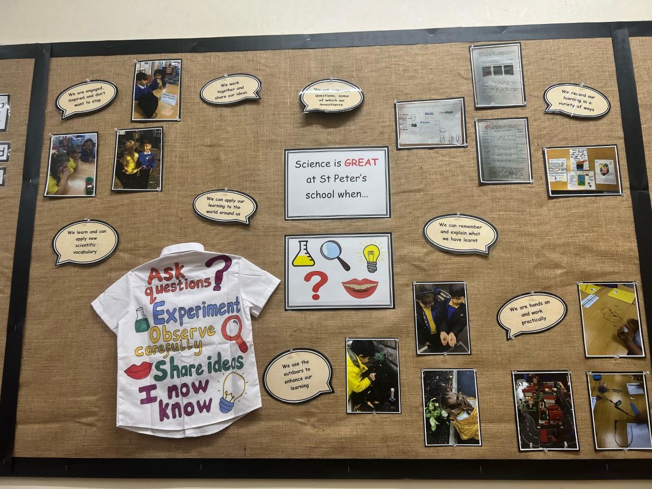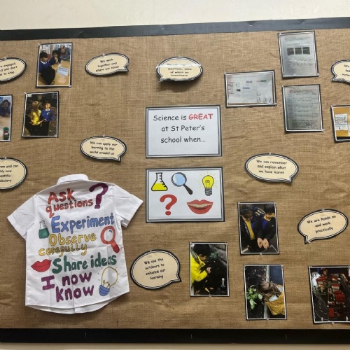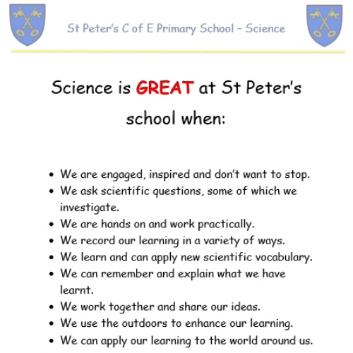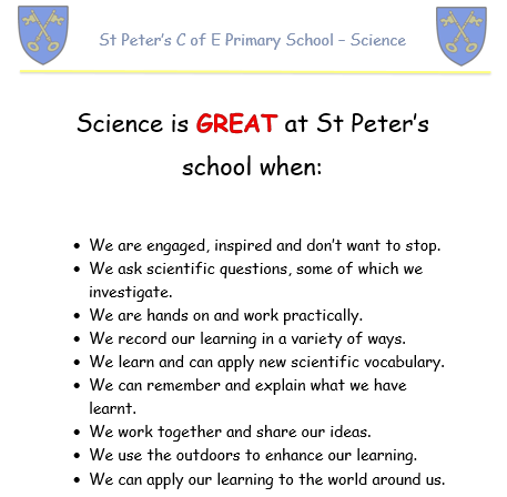 At St Peter’s C of E Primary School ‘Every Child of God Matters’ The Science Curriculum at St Peter’s is inclusive, engaging and exciting and provides a foundation for understanding the world. We strive to foster children’s natural curiosity and to inspire awe and wonder. We aim for a culture of raising questions and making decisions about how to answer them. Pupils will achieve through discussing, planning and carrying out a range of scientific enquiries, developing a rich scientific vocabulary through which to communicate their ideas.
